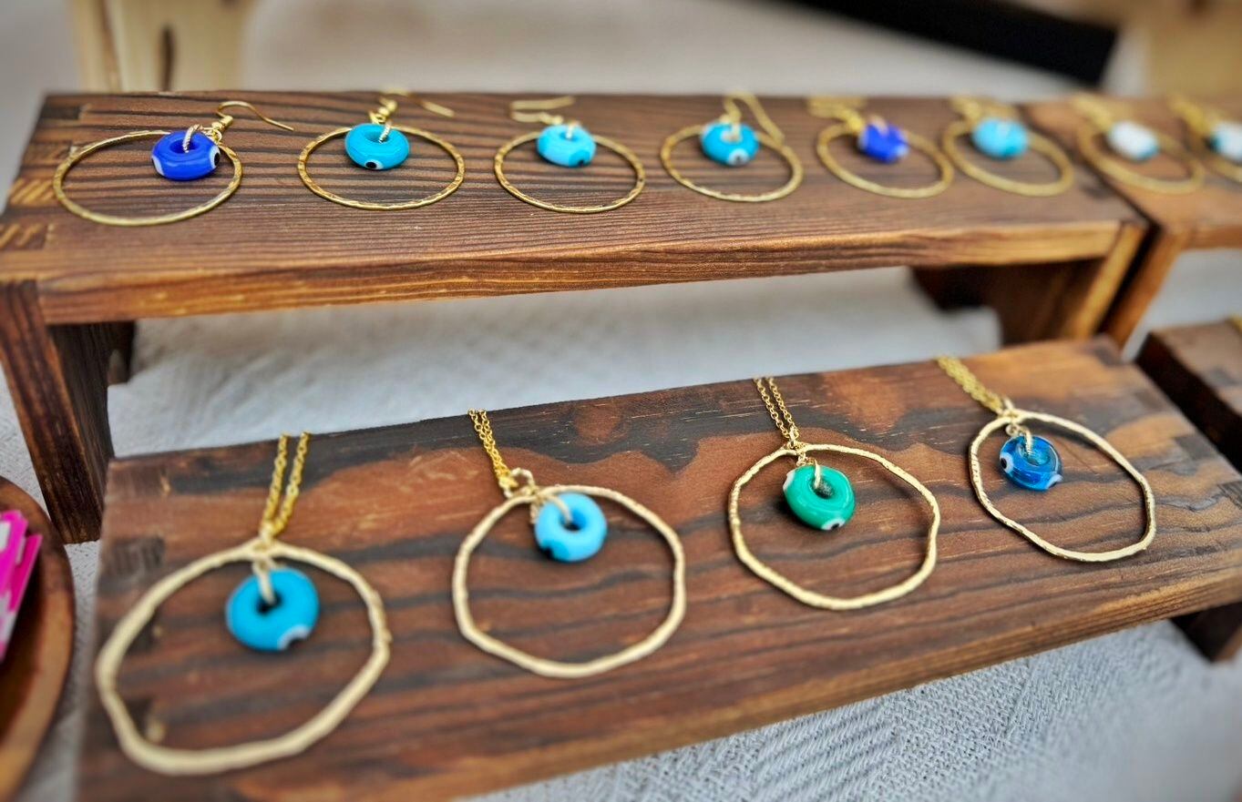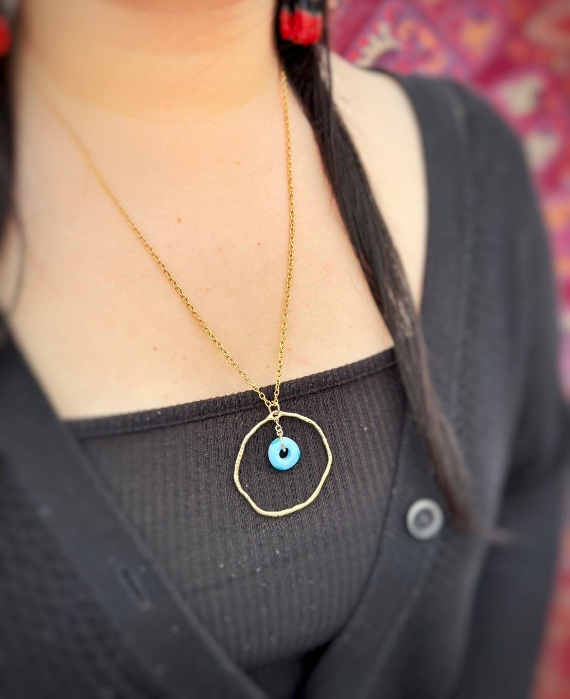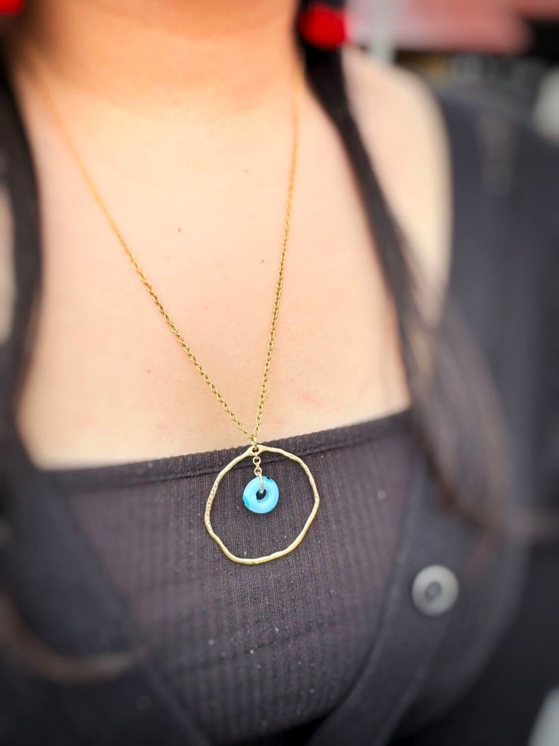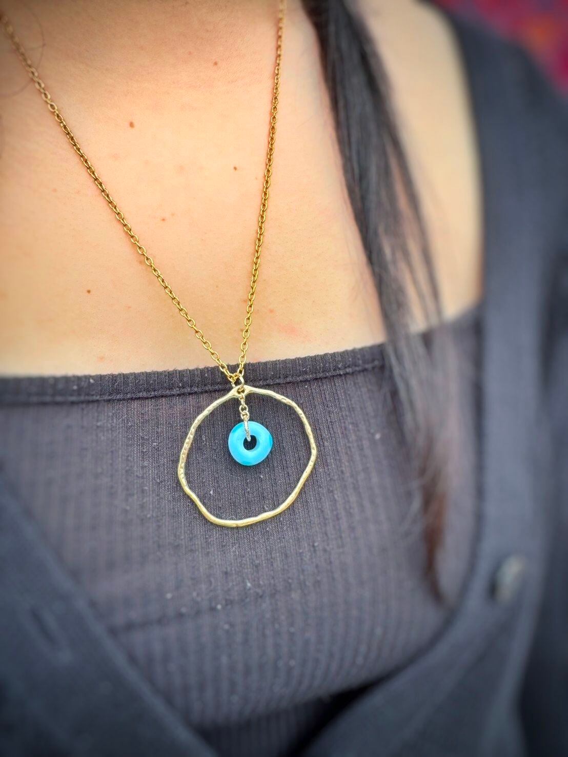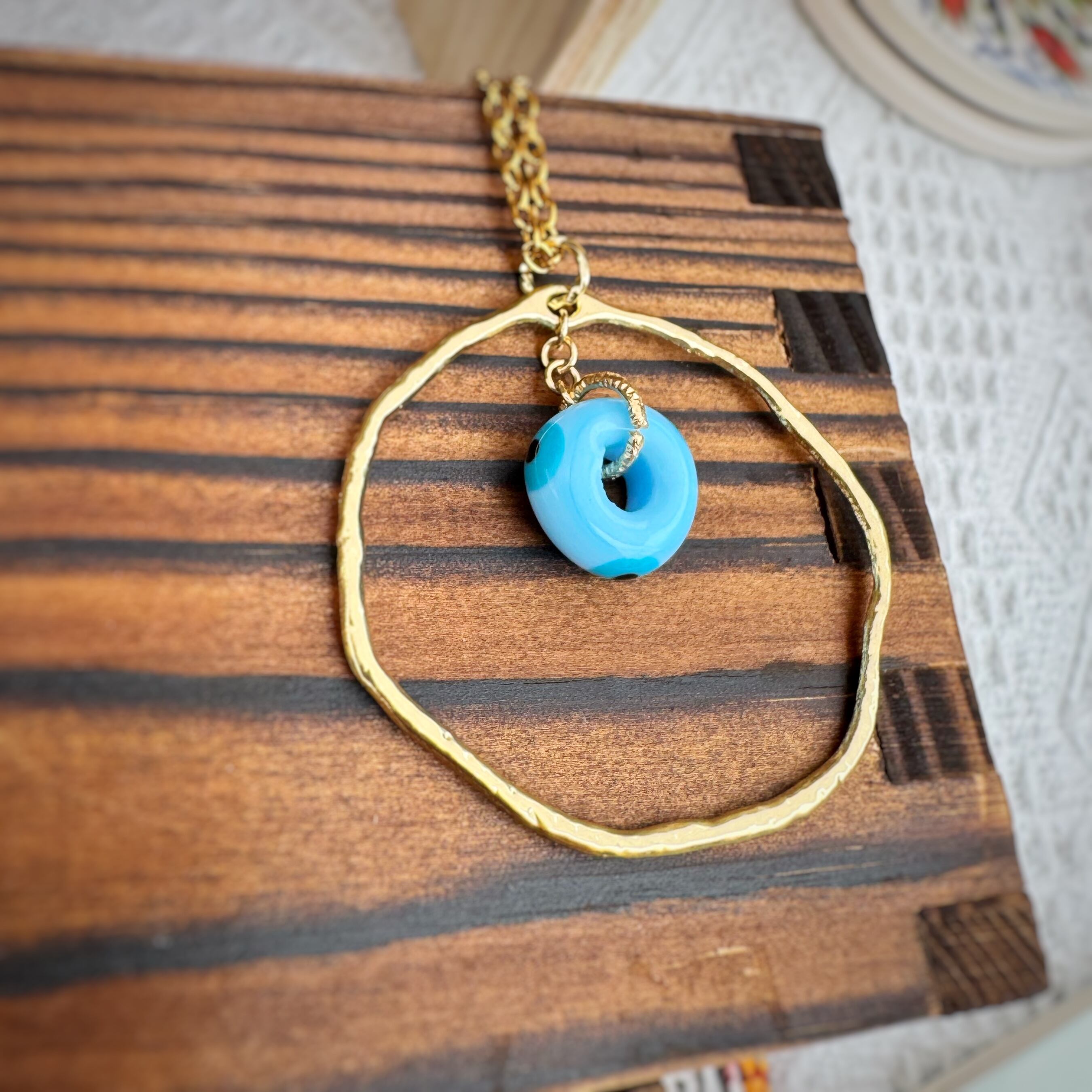 トルコで仕入れた、ドーナツ型のナザボンビーズを可愛いフープタイプのネックレスにしました!